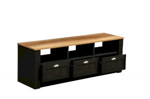 Размеры данной тумбы позволяют поставить на нее самый большой телевизор, ведь ее длина – целых 1380 мм! Тумба разделена на одинаковые три части, которые, в свою очередь, тоже зонированы. Под столешницей находятся три открытые полки-ниши, под которыми – выдвижные ящики. Каждая полка из ЛДСП выдерживает нагрузку до 5 кг. Разделение полок обеспечивает дополнительное укрепление конструкции.